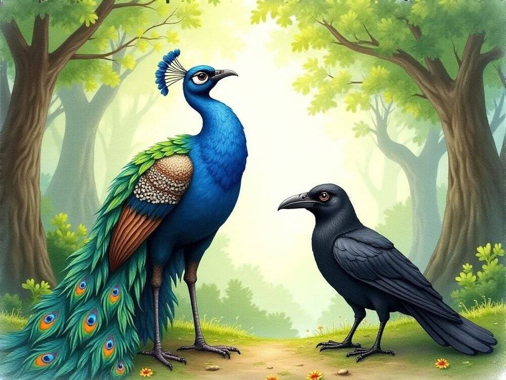 Un giorno, il pavone stava passeggiando nel bosco quando vide un corvo. Il corvo era un uccello nero, con piume lisce e lucide.